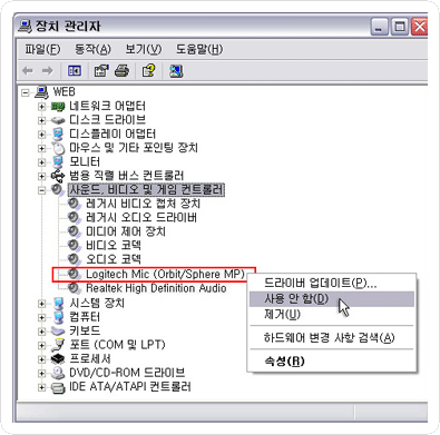 - 내장 마이크 포함 모델일 경우, [내컴퓨터 오른쪽 클릭 → 속성 → 하드웨어 → 장치관리자 사운드 및 게임 컨트롤러] 항목에서