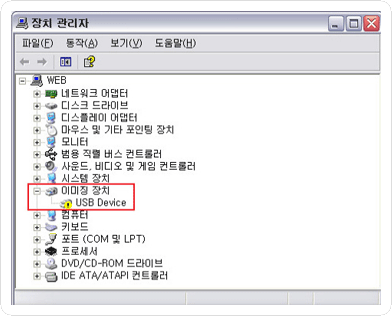 [이미징 장치] 또는 [기타 장치] 항목에 느낌표 표시가 나왔다면 드라이버 설치가 잘못된 경우입니다.