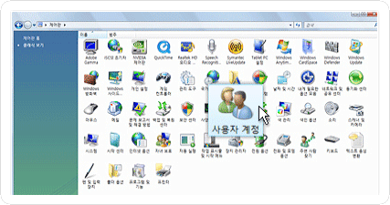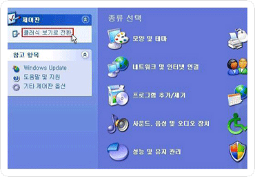 제어판 화면이 아래의 그림처럼 나온다면 [클래식보기로 전환]을 클릭합니다.