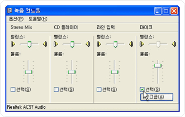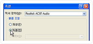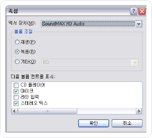 ② 옵션 → 속성 → 볼륨조정 부분의 [녹음]또는 믹서장치의 [Input] 장치 선택 →내용 중 [마이크]와 [Stereo Mix]를 체크 후 확인