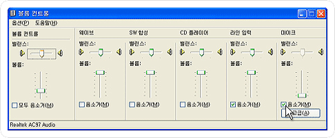 ③ 볼륨컨트롤 메뉴 중, [옵션]선택 후 [속성]을 클릭하여 볼륨조정 부분의 [녹음]선택 후 [확인]을 클릭합니다.